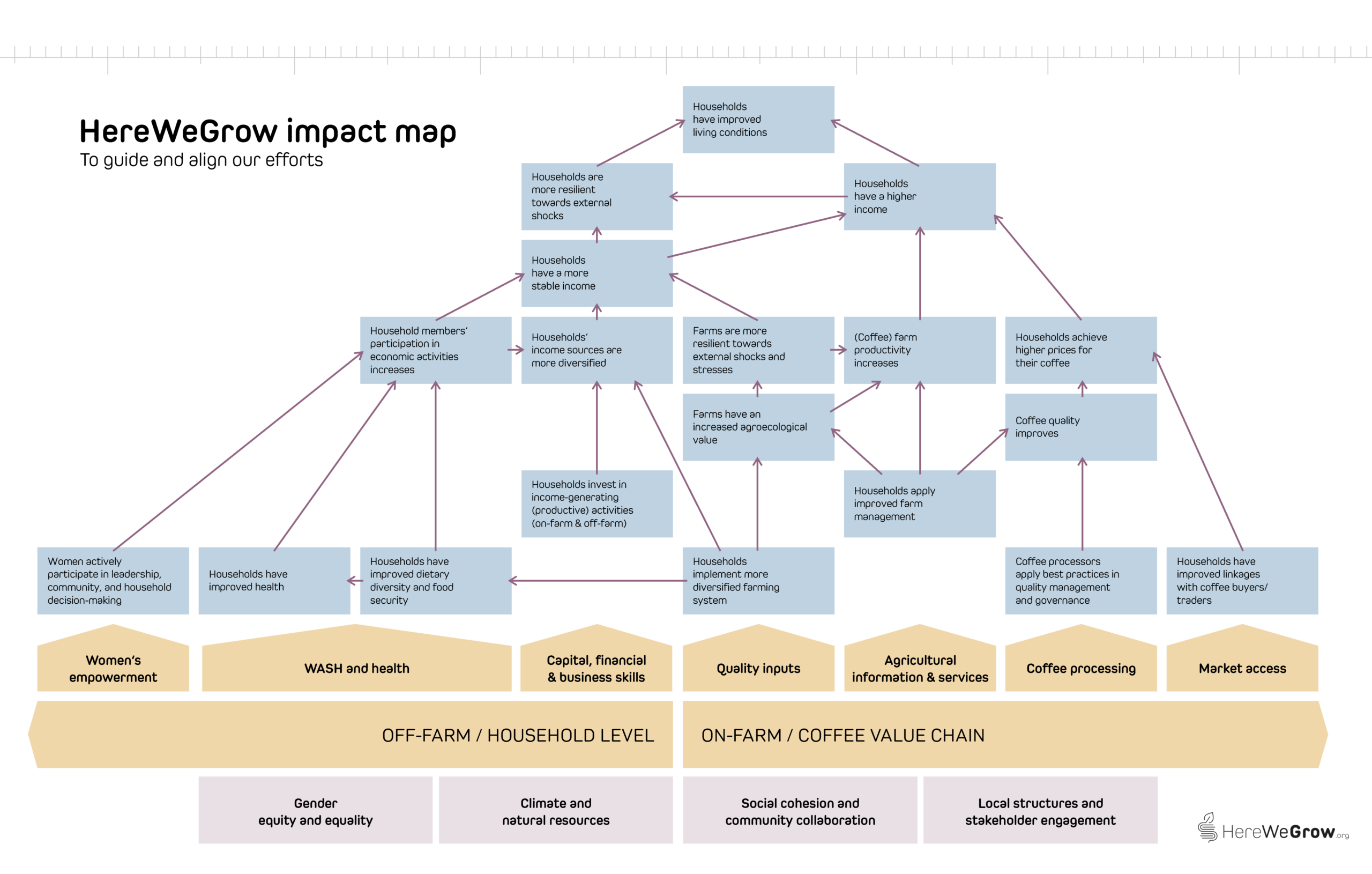 At HereWeGrow, we believe that real change begins with clarity of purpose and a roadmap to get there. That’s why we created the HereWeGrow Impact Map — a framework to guide and align our efforts toward achieving meaningful and sustainable improvements in income for households in coffee communities.